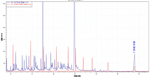 樣品TIC圖(藍色)與多溴聯苯醚混標TIC圖(紅色)