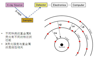 X射線熒光光譜技術(XRF)的原理見圖3所示,可以直接檢測固體或液體樣品中ppm量級的元素成分。采用富集后再檢測的辦法,使得XRF技術對空氣顆粒物中的重金屬成分的檢測限優于0.001ug/m3。而常規實驗室的檢測技術,由于預處理消解過程中需要將微克量級的樣品溶解到幾十克的液體中,而使得濃度被稀釋百萬倍,從而多數儀器(譬如ICP-AES、或原子吸收光譜儀)無法檢出元素含量低于10ug/m3量級的空氣顆粒物樣品。
