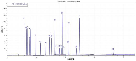 1. α-六六六;2. β-六六六;3. γ-六六六;4. 蒽-D10(內(nèi)標(biāo));5. δ-六六六;6. 七氯;7. 艾氏劑;8. 環(huán)氧七氯B;9. γ-氯丹;10. 硫丹I;11. α-氯丹;12. 4,4'-DDE;13. 狄氏劑; 14. 異狄氏劑;15. 硫丹 II;16. 4,4'- DDD; 17. 異狄氏醛;18. 硫丹硫酸酯;19. 4,4'-DDT;20. 異狄氏酮; 21. 甲氧DDT;22. 苝-D12(替代物);