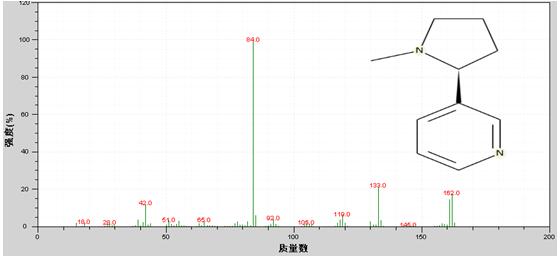 尼古?。?span>Nicotine),俗名煙堿,是一種存在于茄科植物(茄屬)中的生物堿,也是煙草的重要成分之一。尼古丁會使人上癮或產生依賴性,重復使用可導致心臟速度增加、血壓升高和食欲降低,攝入大劑量尼古丁會引起惡心甚至嘔吐,嚴重禍及死亡。氣相色譜質譜聯用儀(GCMS),采用氣相色譜分離和電子轟擊電離源(EI)配合全掃描模式完成定性分析,GCMS-SIM模式實現定量分析,可應用于煙草中尼古丁的檢測。